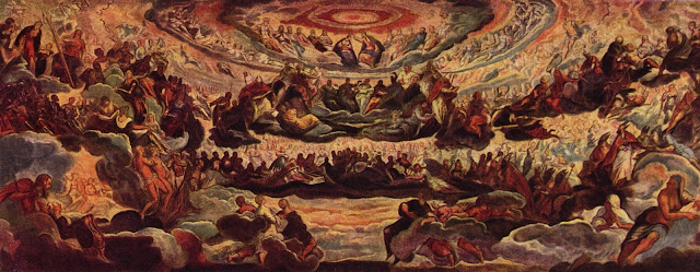 Artists in the 1500s couldn't paint what they wanted; it was either portraits of the rich and famous, a specialty of Titian, or religious scenes, maybe mythological themes on occasion, or, especially in Venice, full of more power and money than anyplace not only in Italy but in all of Europe, weird combinations of politics and religion. Look at the painting above; Tintoretto is literally introducing some rich stiffs to Jesus and the saints, as if you can buy your way to heaven. Seeing all the gigantic churches in Venice, that was a common assumption back in those days.